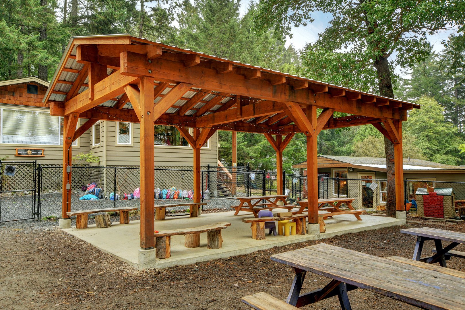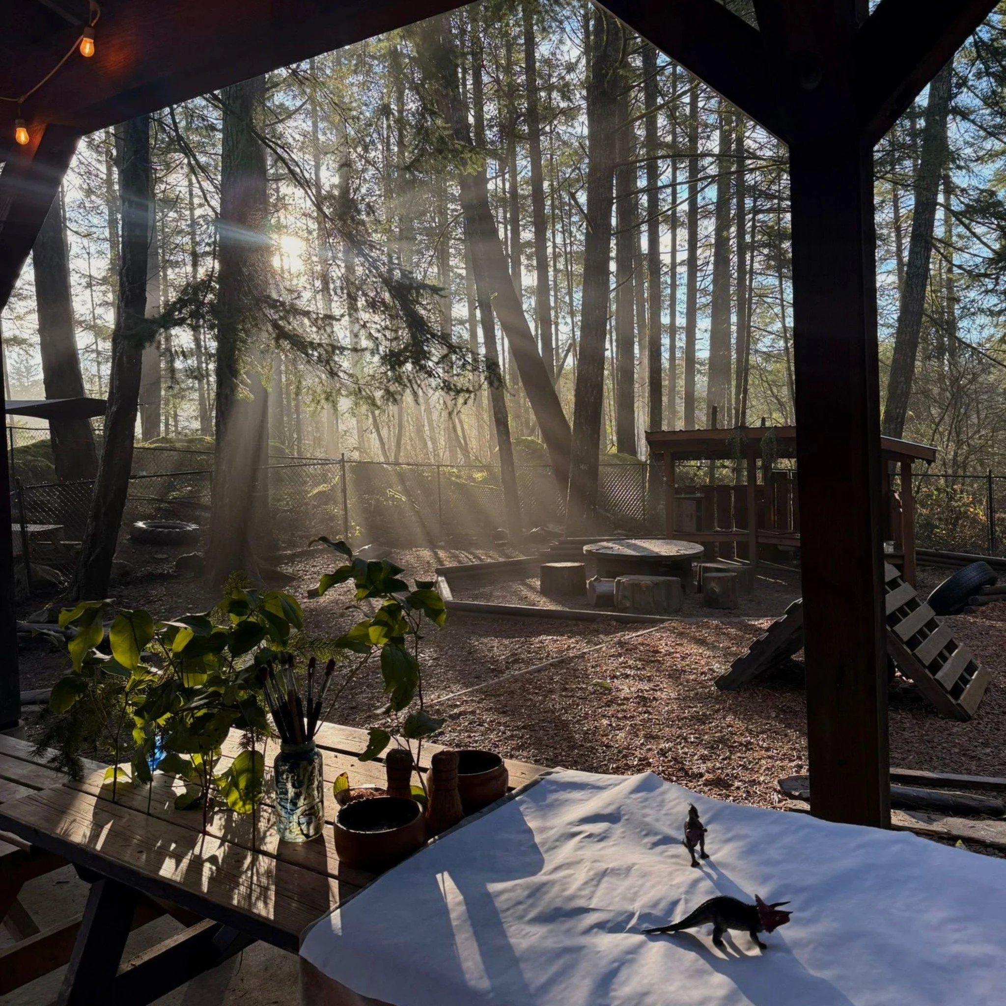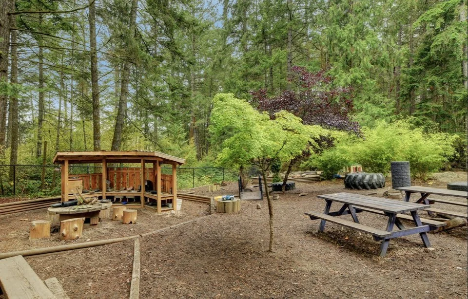 We believe children play best when things are kept grounded. Our space is fully fenced and features a mix of natural play structures, a mud kitchen, and plenty of room to run. We have designated spots for a gift table and snacks, and we'll have a clean, accessible restroom available for your guests to use so you don't have to worry about the logistics.