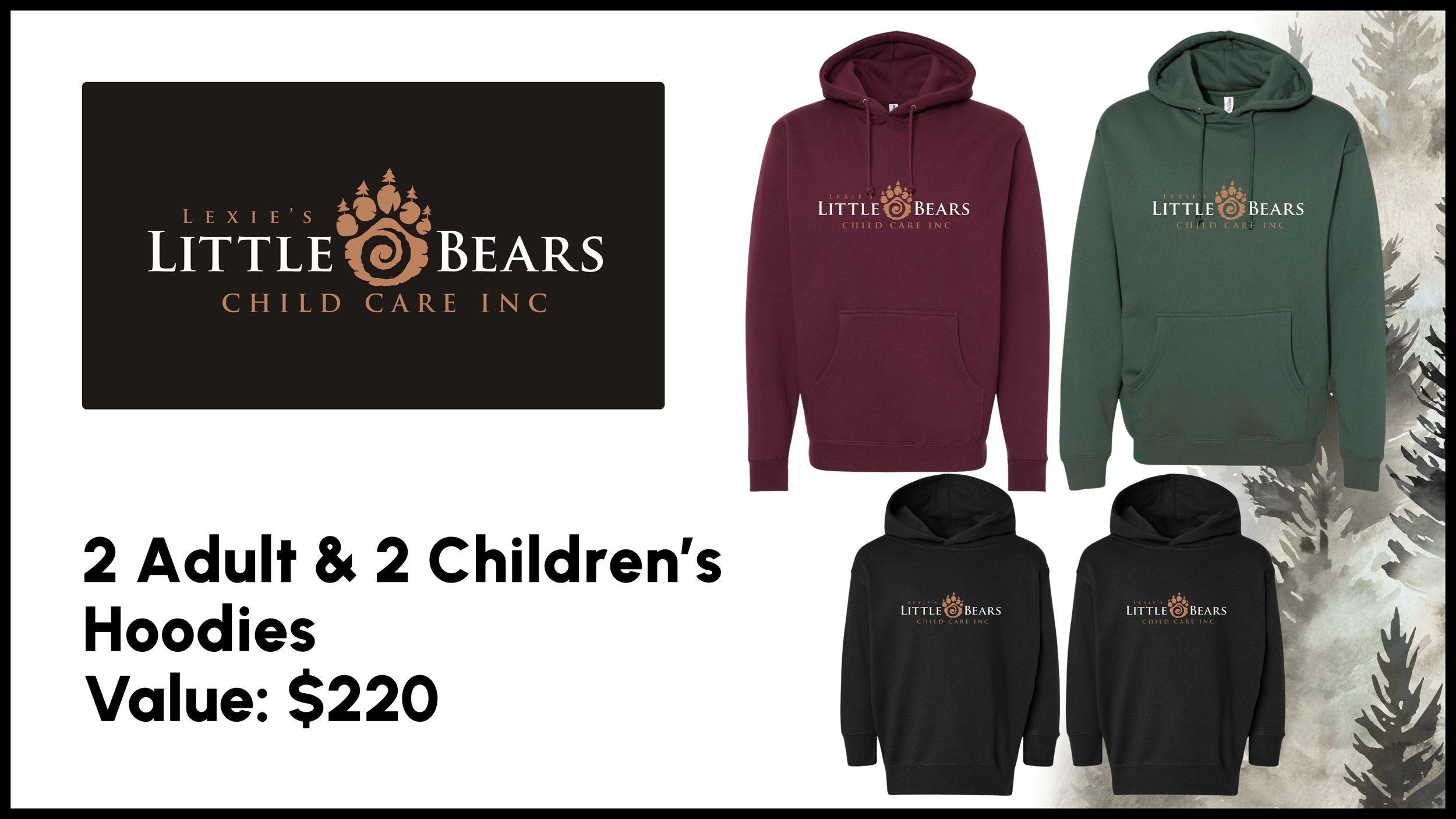 Get the whole family ready for your next outdoor adventure with this exclusive apparel bundle from Lexie’s Little Bears Child Care Inc. These hoodies aren't just cozy—they’re a badge of honor for our nature-loving community. Perfect for chilly morning drop-offs, weekend hikes, or backyard campfire sessions.